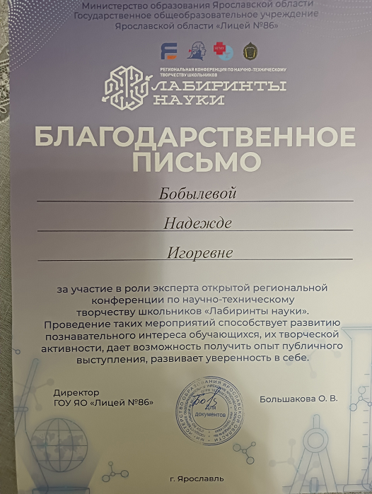 6 декабря 2025 г. сотрудник ЦНППМ Бобылева Надежда Игоревна, к.б.н.. доцент, старший методист ЦНППМ ГАУ ДПО ЯО ИРО, приняла участие в работе жюри VI региональной открытой конференции по научно-техническому творчеству школьников «Лабиринты науки», которая прошла на площадке ярославского лицея №86 – базовой школы РАН, с участием представителей 14 регионов России.