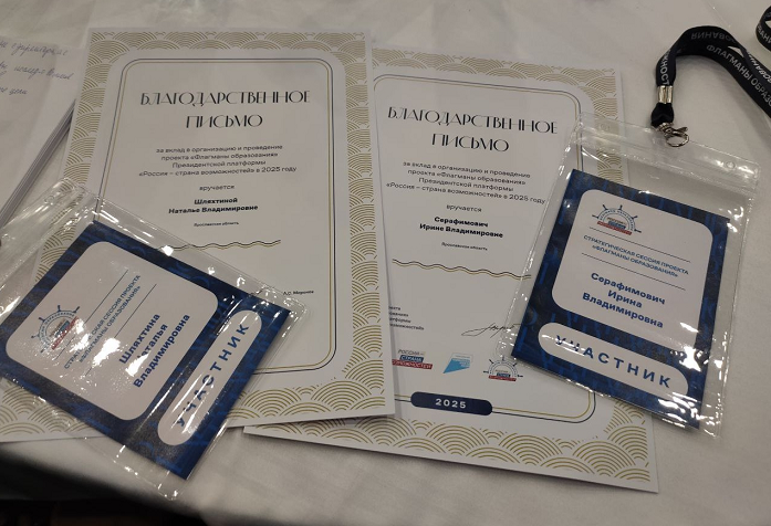 Ирина Владимировна Серафимович и Наталья Владимировна Шляхтина были отмечены благодарственными письмами «за вклад в организацию и проведение проекта «Флагманы образования» Президентской платформы «Россия – страна возможностей» в 2025 году».